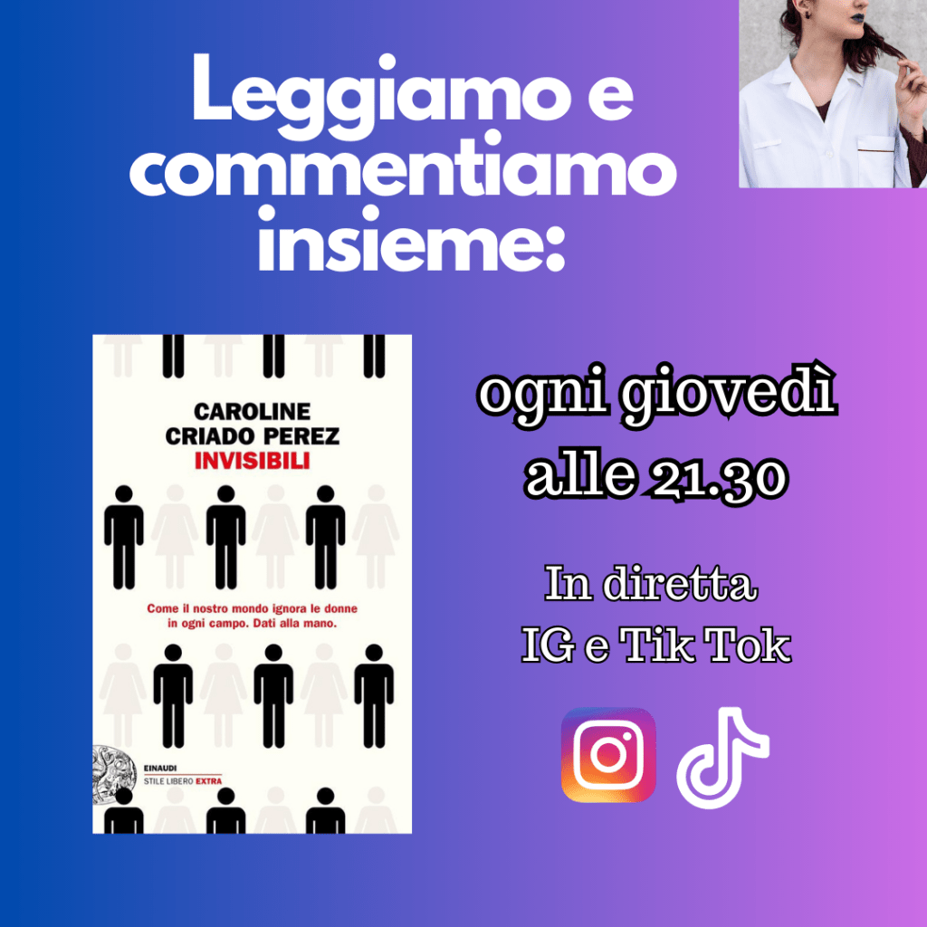 Ogni giovedì alle 21.30 vi aspetto in diretta su Instagram e su Tik Tok per leggere e commentare insieme il saggio di Caroline Criado-Perez “Invisibili. Come il nostro mondo ignora le donne in ogni campo. Dati alla mano“.