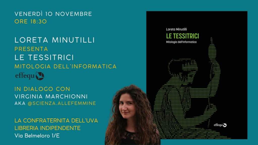 Venerdì 10 novembre alle ore 18:30, modererò la presentazione del libro “Le tessitrici. Mitologia dell’informatica” di Loreta Minutilli, edito da Effequ. La presentazione è alla Confraternità dell’Uva (Libreria Indipendente, Via Belmoro 1/E, Bologna).