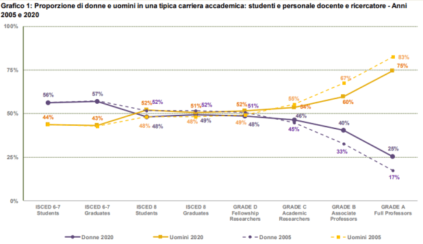 Dai dati sulla presenza femminile nella carriera accademica emergono due fenomeni: