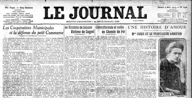 “Una storia d’amore: Madame Curie e il professor Langevin”, titolava Le Journal, quotidiano francese. I media descrivevano come scandaloso l’abito bianco con un fiore rosso con cui si era recata a una cena, e dipingevano la scienziata premio Nobel come una donna straniera, seduttrice e rovina famiglie.